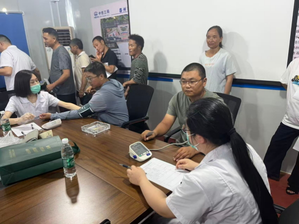 体检现场设置在项目部会议室内,划分了登记区、采血区、检查区等功能区域,确保流程高效有序。工友们有序排队,依次接受检查。“平时工作忙,很少有机会去医院做全面检查,这次在工地上就能体检,太方便了!”来自盐城的陈师傅拿着体检表高兴地说。